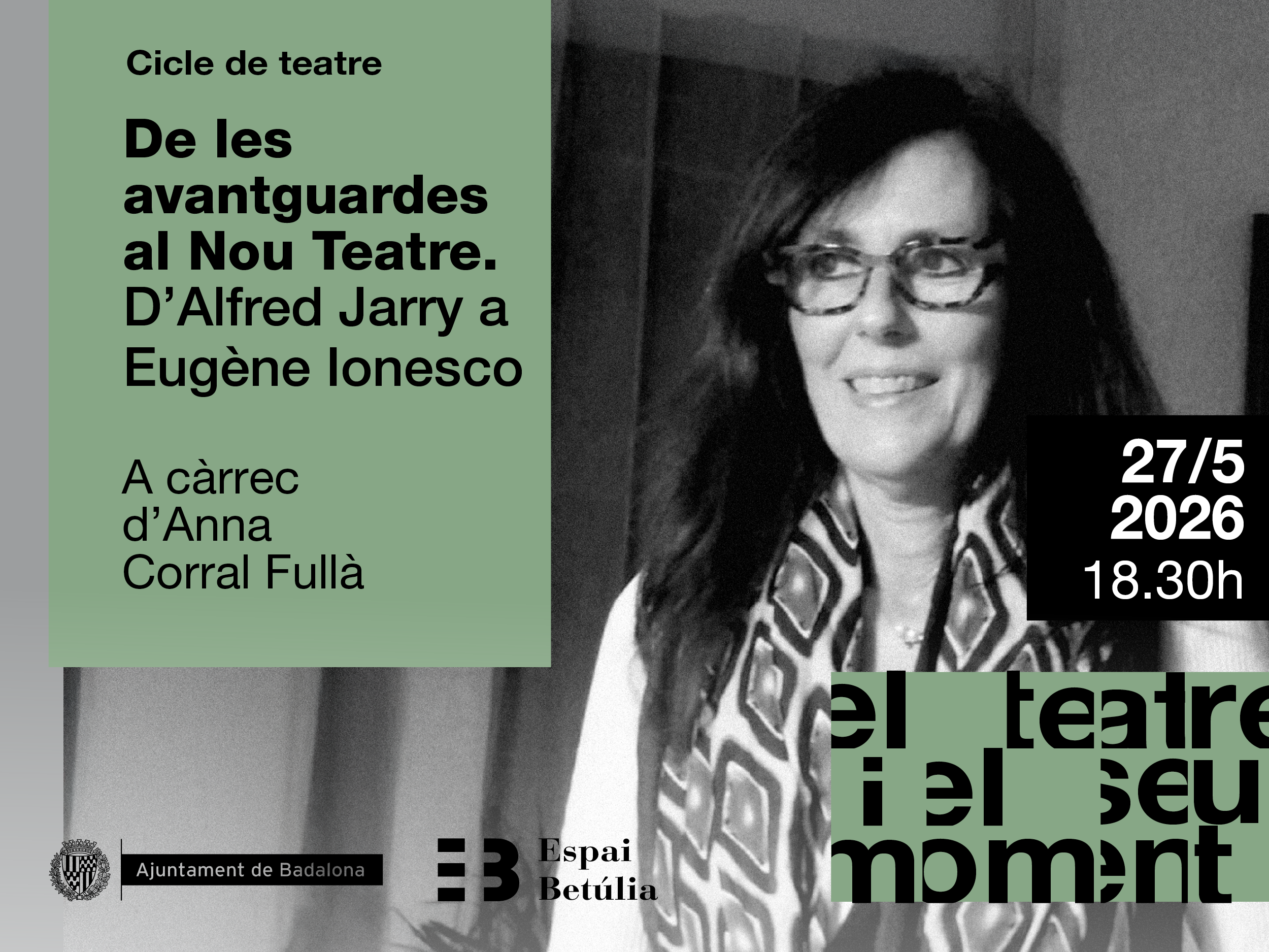 El “De les avantguardes al Nou Teatre (D’Alfred Jarry A Eugène Ionesco)” per Anna Corral Fullà se celebra el dimecres, 27 de maig del 2026, de 18:30 a 19:30, a Badalona.
